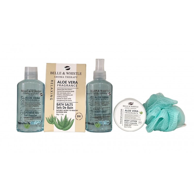 140ml gel douche, 140ml brume corporelle, 50ml lotion corporelle, 50g sels de bain, 1 fleur de massage.