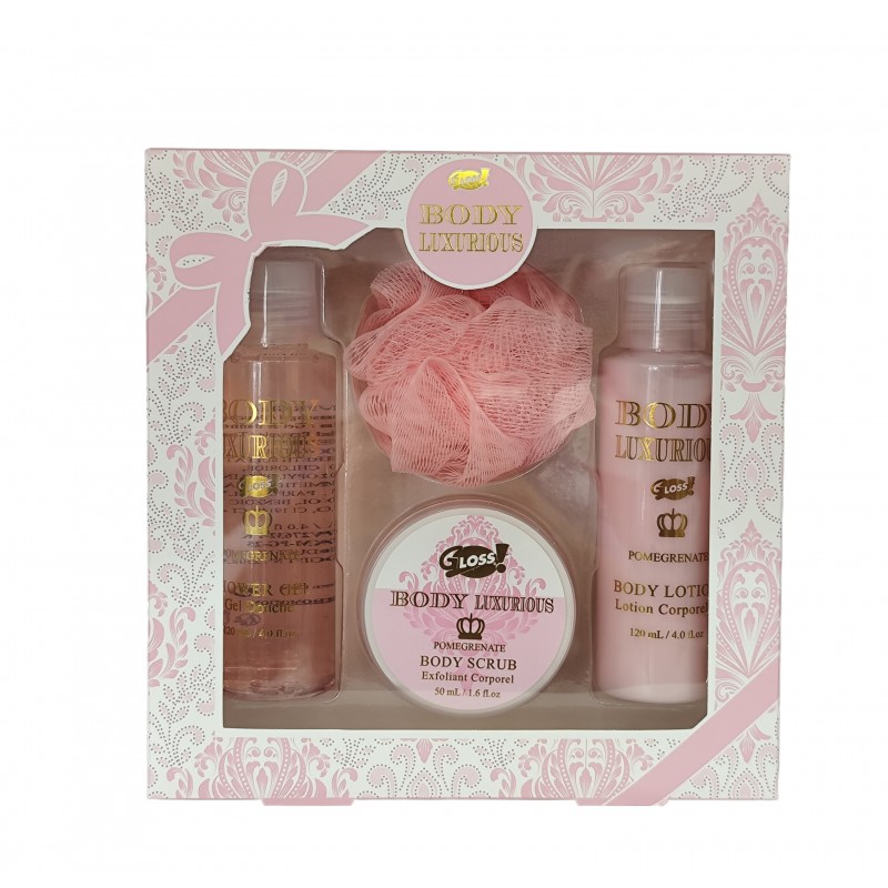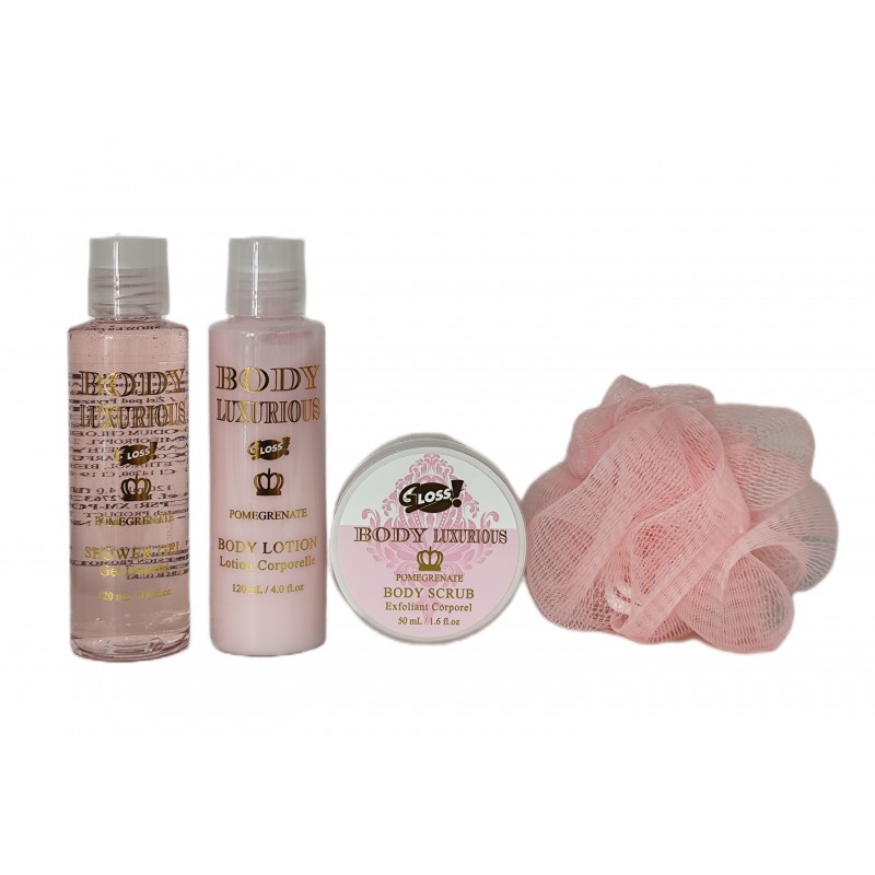 120ml gel douche, 120ml lotion corporelle, 50ml exfoliant corporel, 1 fleur de massage.