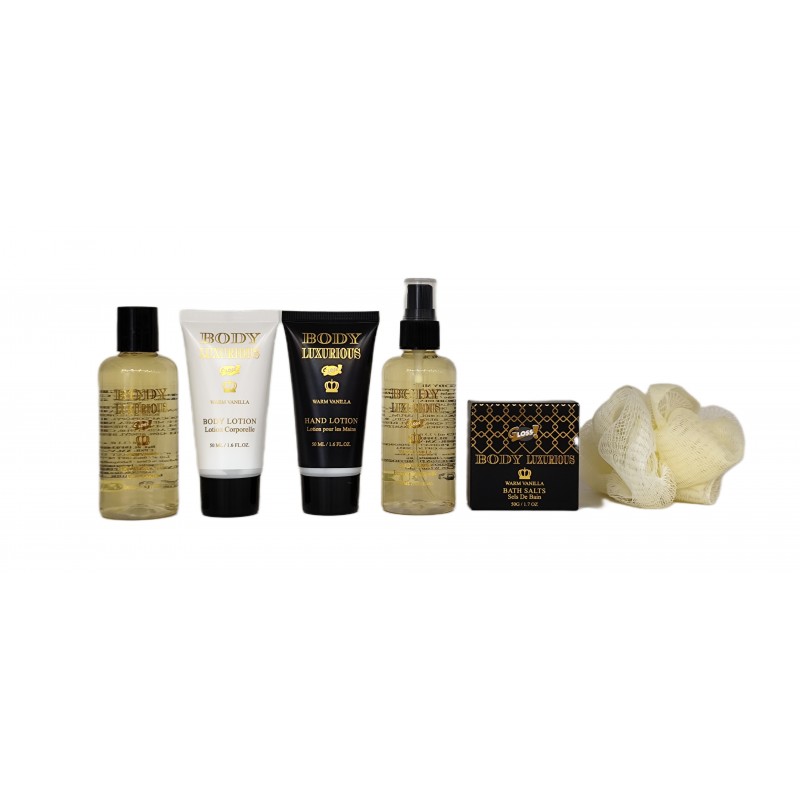 100ml gel douche, 100ml brume corporelle, 50ml lotion corporelle, 50ml lotion pour les mains, 50g sels de bain, 1 fleur de massage.